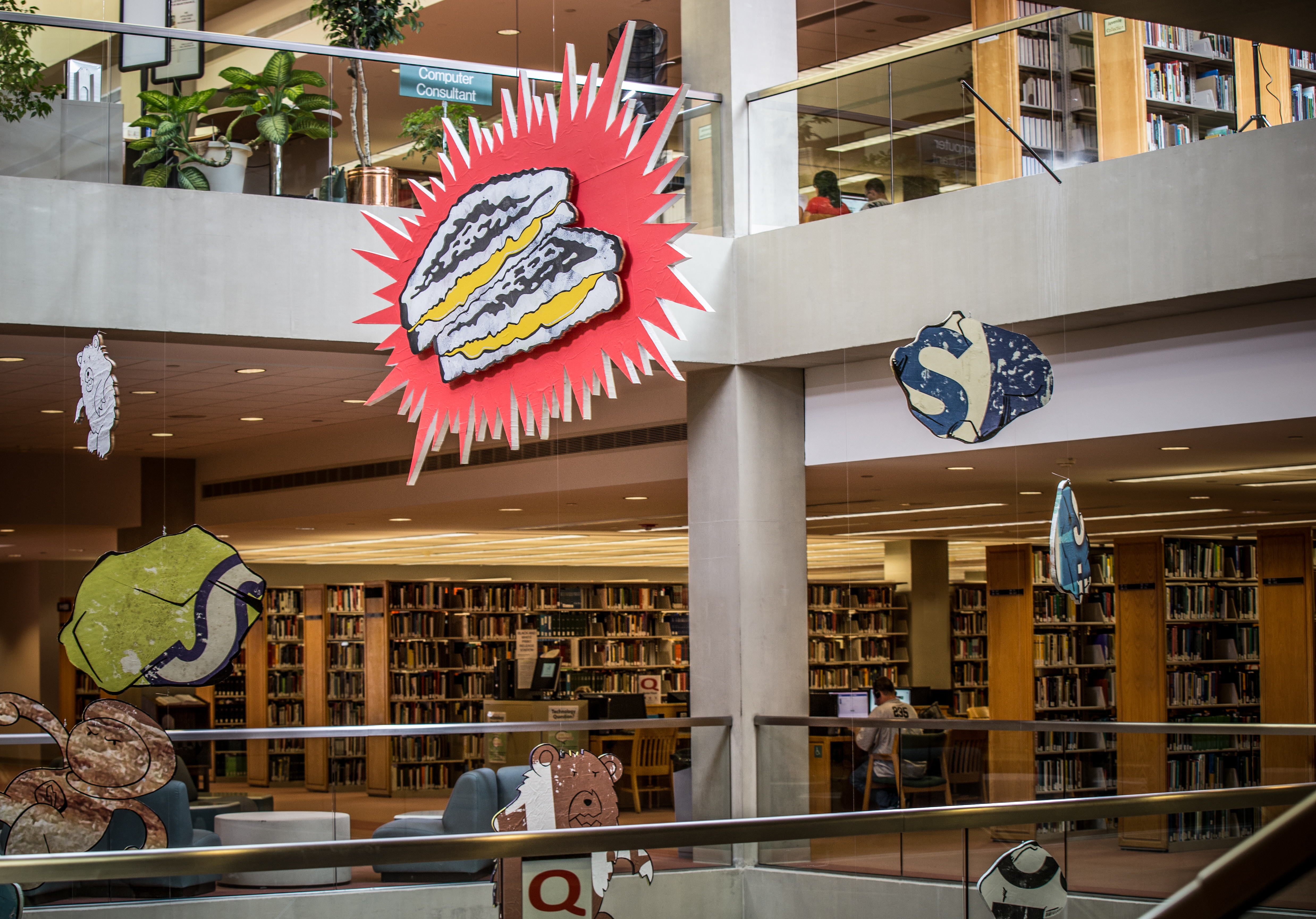 Receiving the IUPUI Library commission has opened up several new avenues for my work. The IUPUI Library has a 45 foot tall atrium and is about 22 foot square. I executed my first mobile in this space. Mobiles such as this one allow my “flat” characters to appear and disappear as they turn from the viewer. In doing so their relationship to each changes as well.